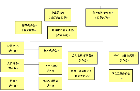 。。對于呼叫中心建設(shè)項目實施的規(guī)劃是一個需要付出巨大心血與努力的階段,這個階段需要企業(yè)或組織機構(gòu)所有人員的廣泛參與和專家意見。對于呼叫中心運營的規(guī)劃,相對與呼叫中心建設(shè)項目而言則顯得有些"特殊",它意味著整個呼叫中心建設(shè)項目團隊不可能有全部的時間花費在運營規(guī)劃議題上。因此,我們可以將全部項目規(guī)劃工作與任務(wù)拆分成若干個規(guī)劃細項,這將保證有較強的可操作性。我們建議采取的方式是將整個項目實施規(guī)劃團隊拆分成負責(zé)各個專項實施的小組委員會或附屬委員會。這些小組委員會將集中關(guān)注各自特定的項目實施上,當(dāng)有需要時,與其他各小組進行交流與溝通,并在相關(guān)問題上達成一致。按照以上項目組織管理架構(gòu)其目的是,在項目實施的關(guān)鍵環(huán)節(jié)和領(lǐng)域,能產(chǎn)生出更具深度的規(guī)劃方案。這樣操作同時可以使更多的人員參與進來,并有利于增強各個小組的責(zé)任感,有助于項目的成功實施。以下的項目指導(dǎo)委員會組織架構(gòu)不是任何呼叫中心建設(shè)項目都能適用的,但是它在某種程度上已經(jīng)為呼叫中心項目規(guī)劃提出了一個基本方針,按照這個思路它將保證項目的成功實施。而對于規(guī)模較小的呼叫中心項目,以上的組織架構(gòu)成員將扮演多重角色,并負責(zé)多項任務(wù)項目的實施。就呼叫中心項目規(guī)劃與實施團隊而言,應(yīng)由若干個負責(zé)不同領(lǐng)域?qū)嵤┑男〗M來組成,以便確保呼叫中心建設(shè)項目的所有領(lǐng)域,及各個階段的有效實施。呼叫中心項目規(guī)劃與實施組織架構(gòu)請見下圖。
