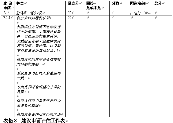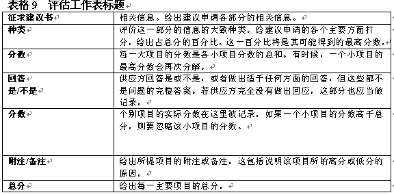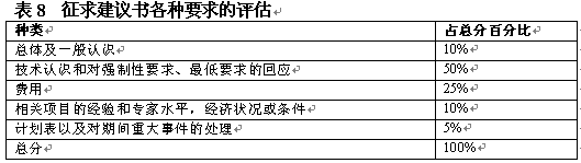 。。在決定了初步要求之后,評估小組應具體地開展評估工作。具體評估的目標是通過給建議書主要方面打分作出評估。可以在算出建議書各方面占總分數(shù)的百分比,如表8中對各方面的總覽。一般在建議書內(nèi)向提供者給出這一信息。