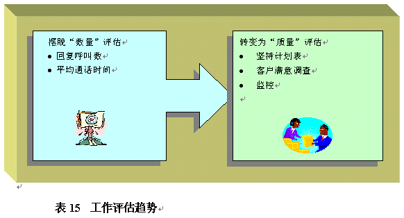 。。這些年呼叫中心工作評(píng)估經(jīng)歷了一些變化。最新趨勢(shì)是擺脫死板的"數(shù)量"評(píng)估,例如回復(fù)呼叫數(shù),通過(guò)客戶滿意度調(diào)查和監(jiān)控進(jìn)行數(shù)量評(píng)估以外的更全面的質(zhì)量評(píng)估。在表14中指出這種最新的工作評(píng)估趨勢(shì)的原因是,大量數(shù)量評(píng)估,例如回復(fù)呼叫數(shù),實(shí)際上已經(jīng)不能使員工在其基礎(chǔ)上進(jìn)行改善。例如,一個(gè)每小時(shí)接聽(tīng)十個(gè)呼叫的員工并不比每小時(shí)僅接聽(tīng)五個(gè)呼叫的員工效率更高。呼叫中心管理者評(píng)估員工工作更好的辦法是在這種數(shù)量評(píng)估中加入額外的質(zhì)量評(píng)估。