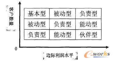 這5種類型之間并不具有簡單的優(yōu)劣對比或順序,因為企業(yè)所采用的客戶關系類型取決它的產品以及客戶的特征,不同企業(yè)甚至同一企業(yè)在對待不同客戶時,都有可能采用不同的客戶類型。一家生產日用化妝品的企業(yè),與它的化妝品消費者個人之間常會建立一種被動型的客戶關系,企業(yè)設立的客戶服務機構或聯(lián)絡中心將聽取客戶的意見,處理客戶投訴以及改進產品;但這家企業(yè)同大型超市或零售企業(yè),同連鎖的美容產業(yè)機構之間,常可能建立一種伙伴型的客戶關系,實現(xiàn)產銷企業(yè)之間的互惠互利?铺乩仗岢,企業(yè)可以根據其客戶的數量以及產品的邊際利潤水平,根據圖3指示的思路,選擇合適的客戶關系類型。